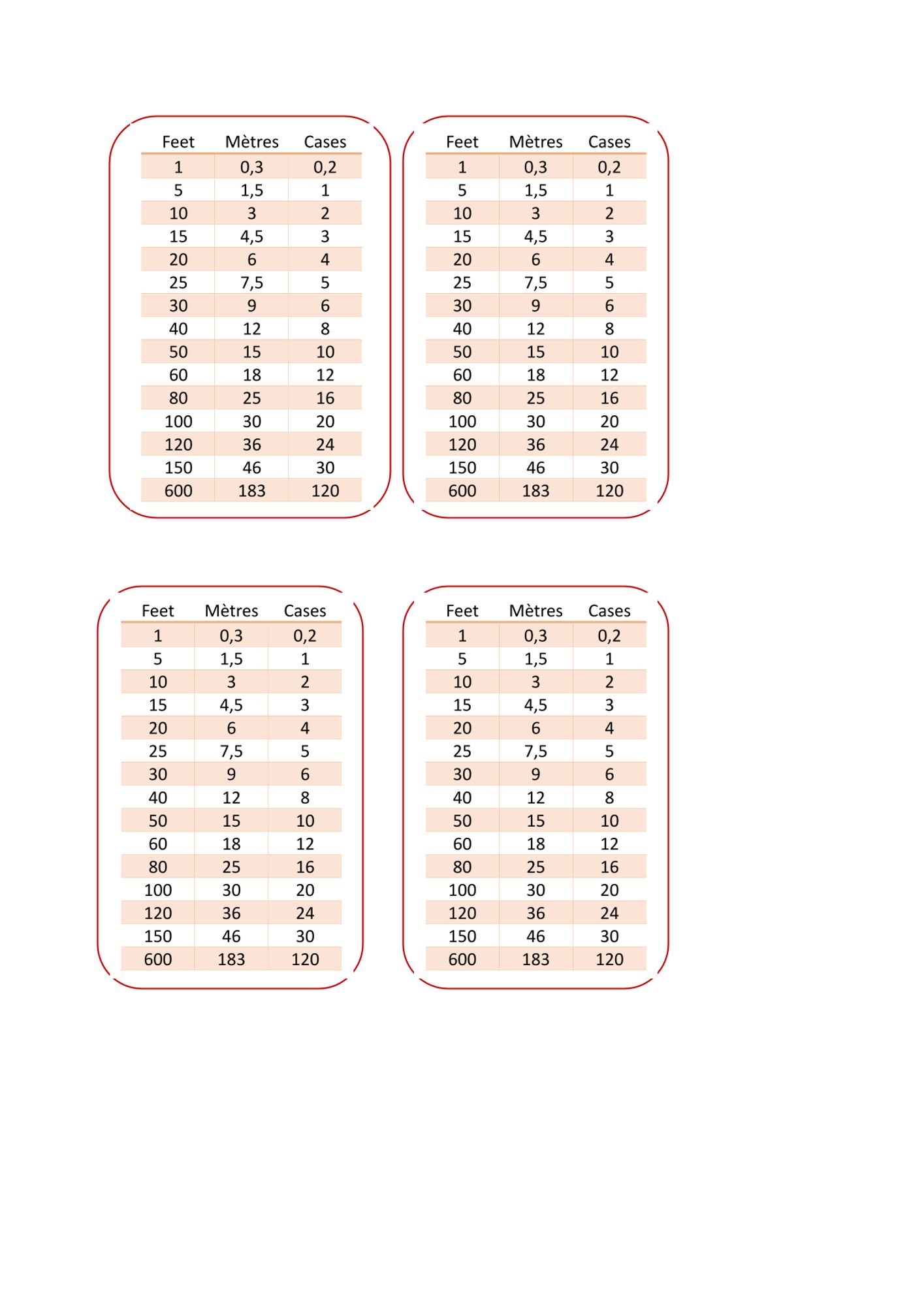 J'ai fait ces petites cartes pour réduire les gymnastiques de conversion d'unité à la table, surtout lorsqu'on utilise une carte avec une grille de jeu et des figurines.